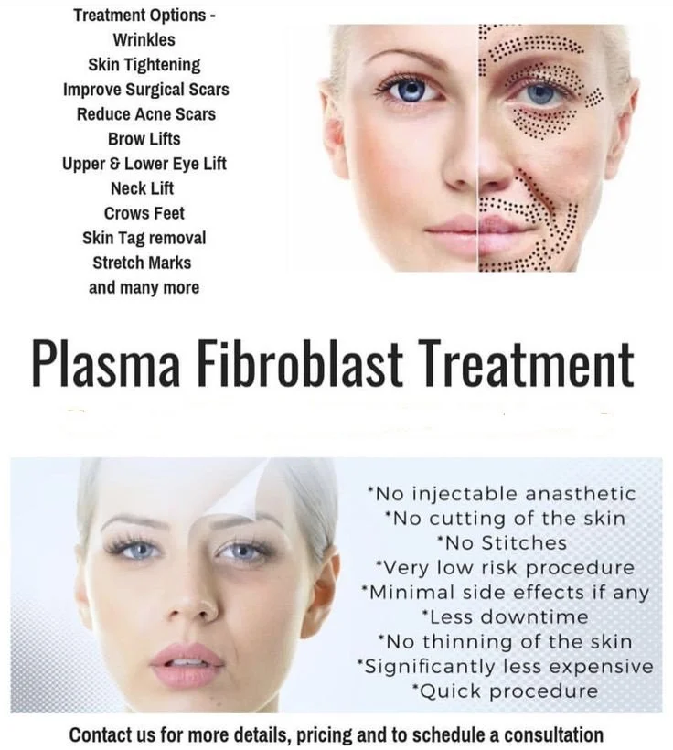 An advertisement for plasma fibroblast treatment listing benefits such as no invasive anesthesia, no skin cutting, no stitches, low risk, minimal side effects, less downtime, no skin thinning, and quick procedure. The image shows before and after photos of a woman's face with improved skin appearance.