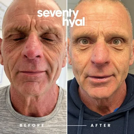 Side-by-side comparison photo of an older man showing a before and after skincare treatment, with 'Seventy Hyal' text, wrinkles reduced in the after image.