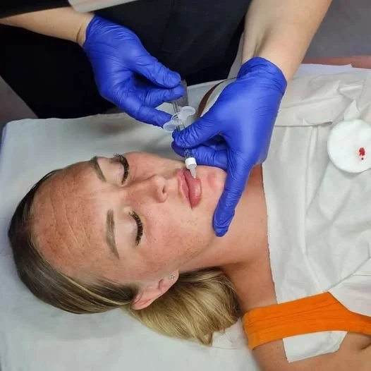 A woman lying on a medical bed receiving an injection in her face from a healthcare worker wearing blue gloves.